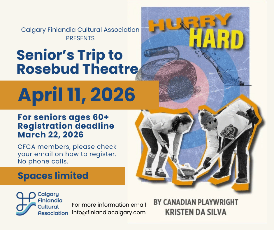 Calgary Finlandia Cultural Association invites seniors 60 years of age or older to join us on a trip to Rosebud Theatre on Saturday, April 11, 2026.